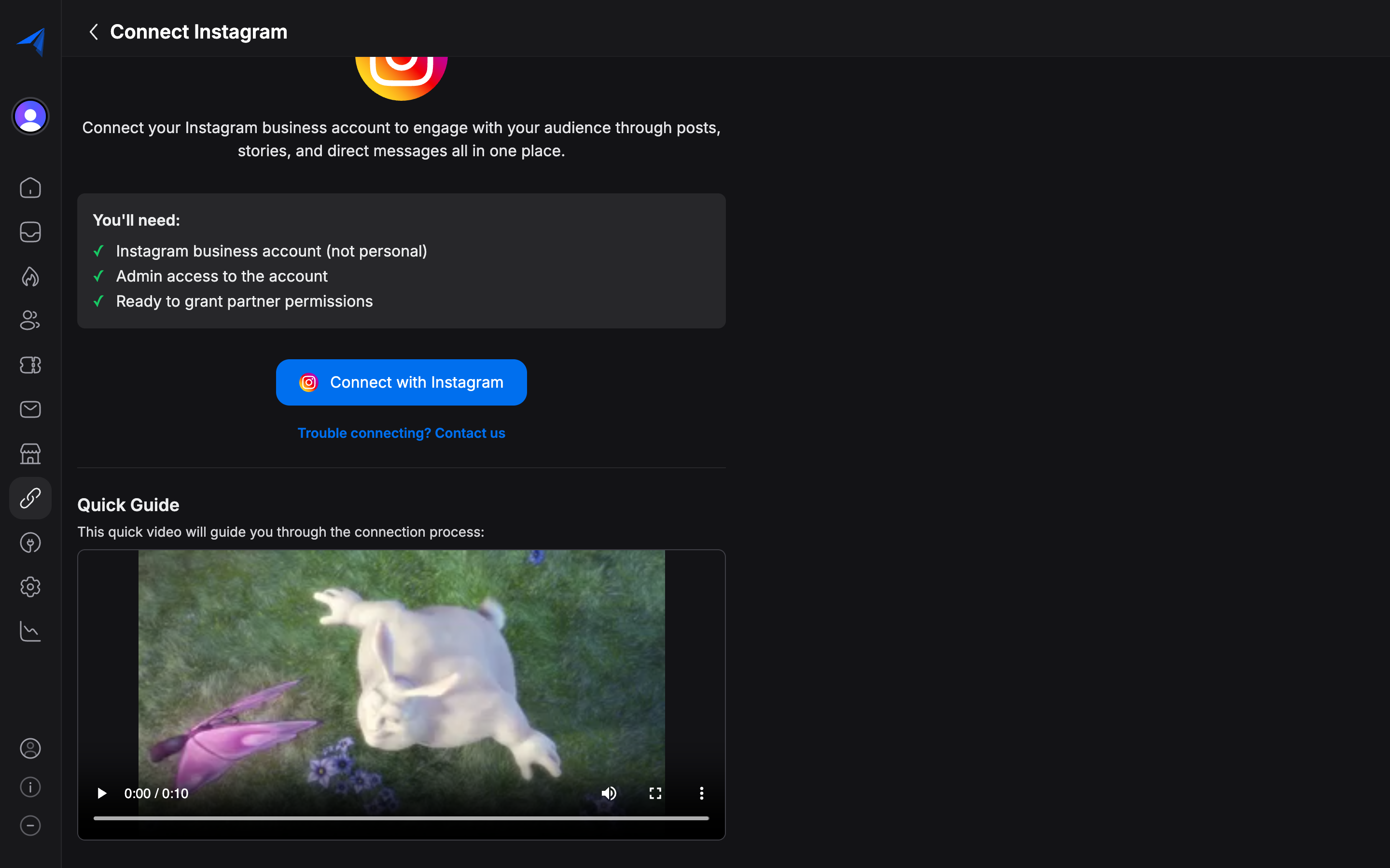 Click Connect with Facebook to begin the OAuth flow. You will be redirected to Facebook where you need to sign in with the account that has admin access to the Facebook Page linked to your Instagram account.