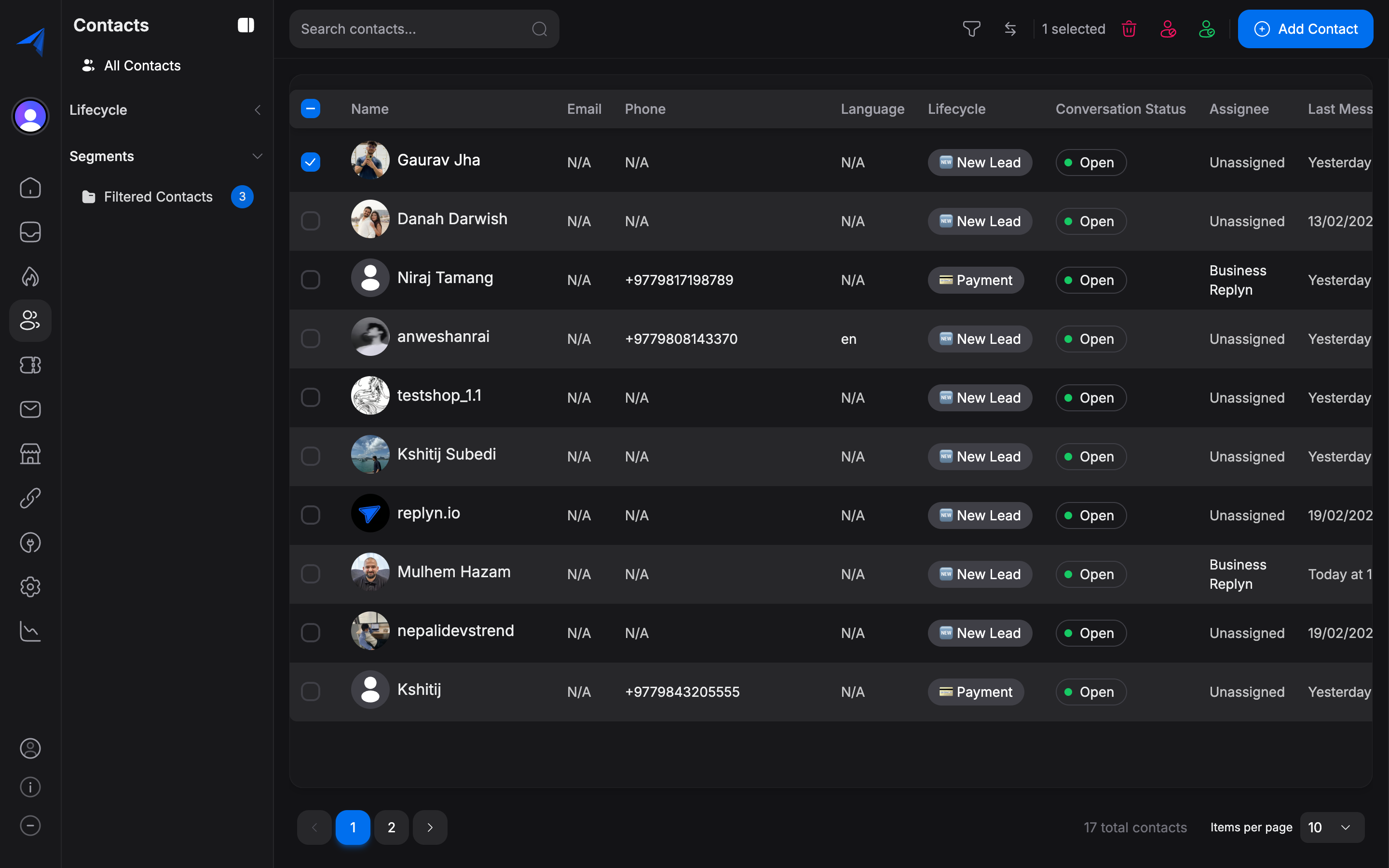 Every contact in Replyn has a lifecycle stage that represents where they are in your business relationship. Lifecycle stages help you track your pipeline, trigger automations, and segment contacts for targeted outreach.