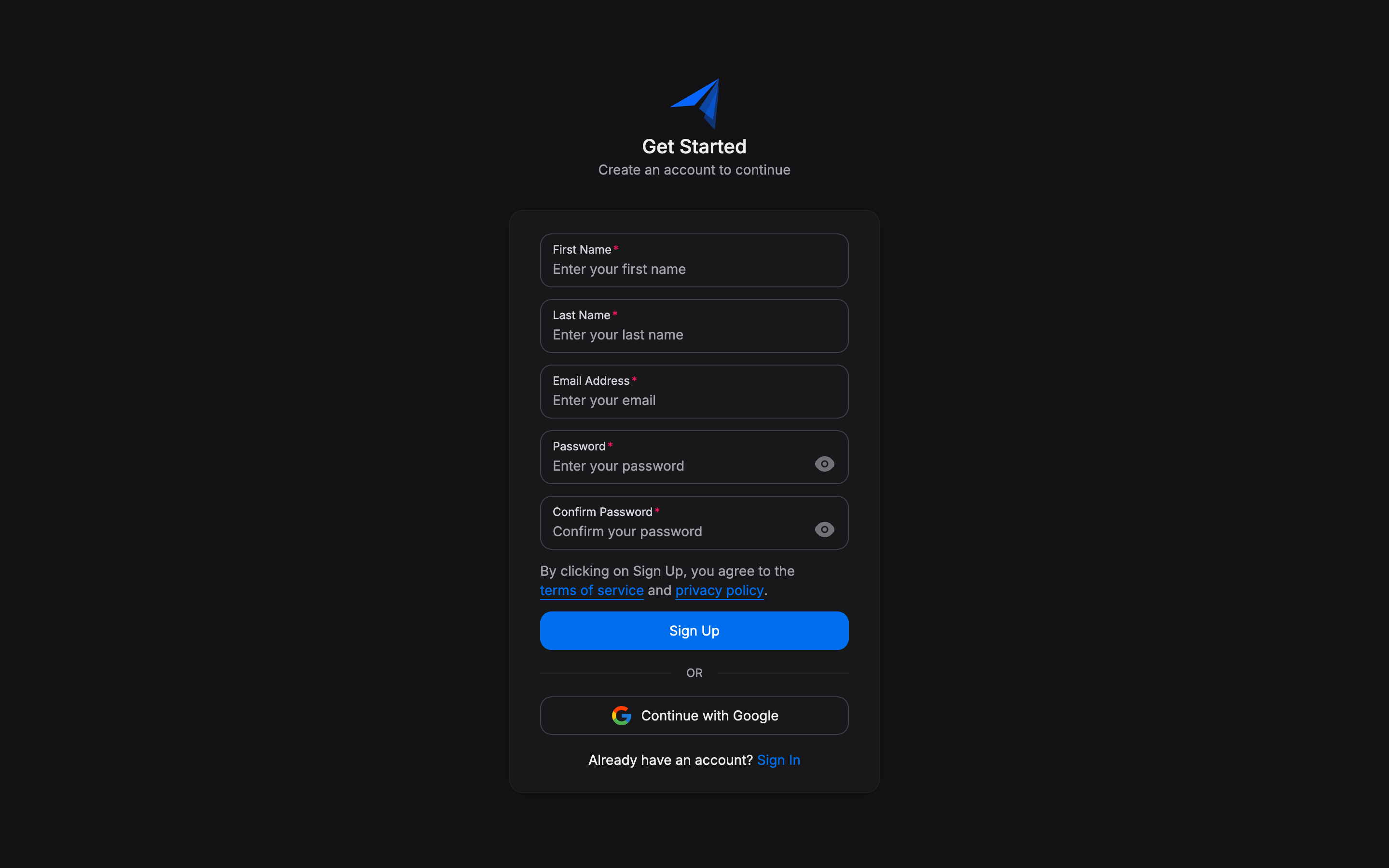 Go to app.replyn.io/auth/sign-up and enter your full name, email address, and a strong password. You can also sign up using your Google account for faster onboarding.