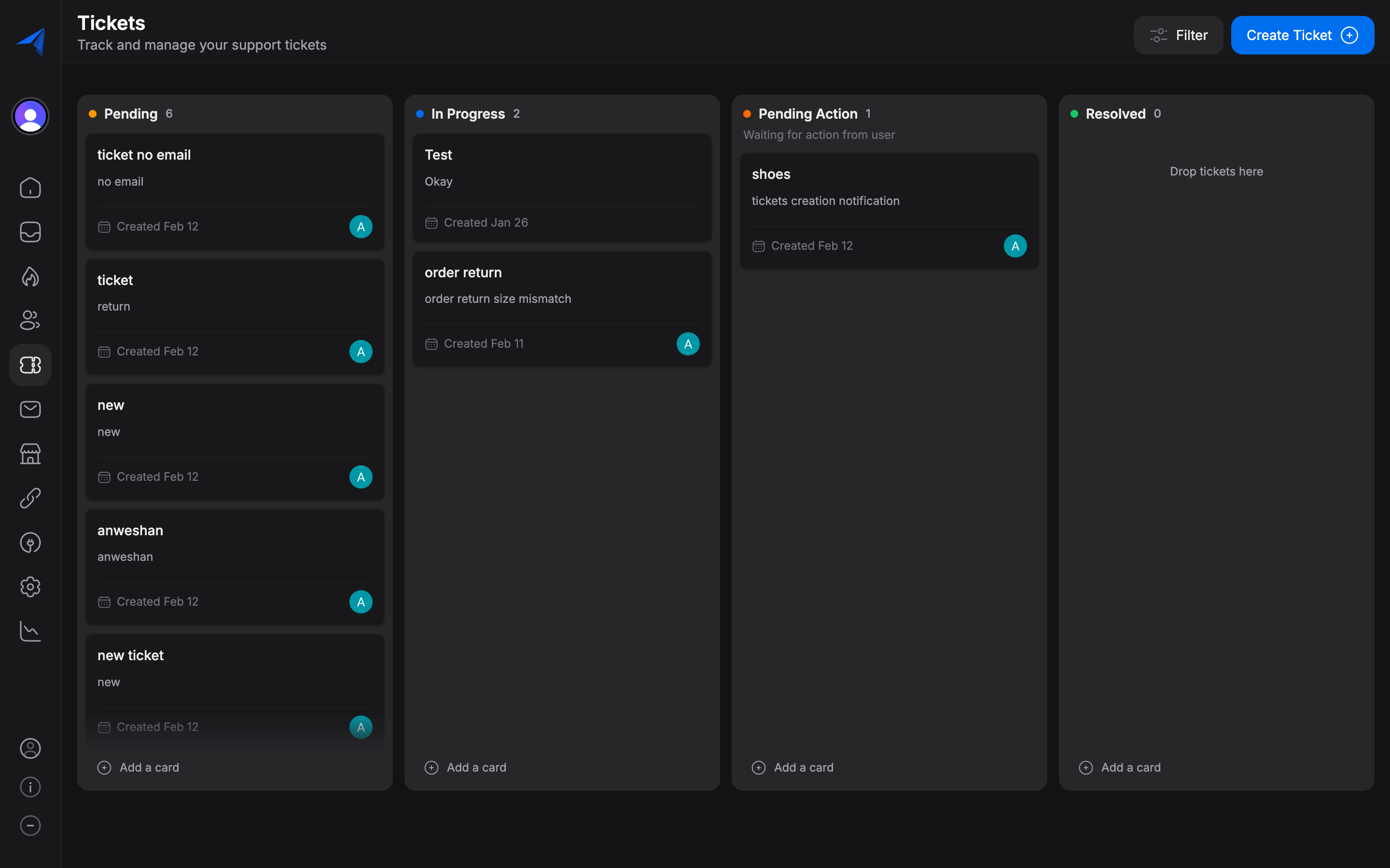 Replyn's ticketing system helps your team track, prioritize, and resolve customer support issues in an organized workflow. Every ticket captures the full context of a customer's problem — from the original conversation to internal notes and status updates — so nothing falls through the cracks.